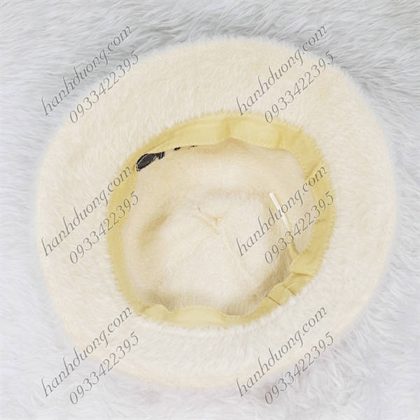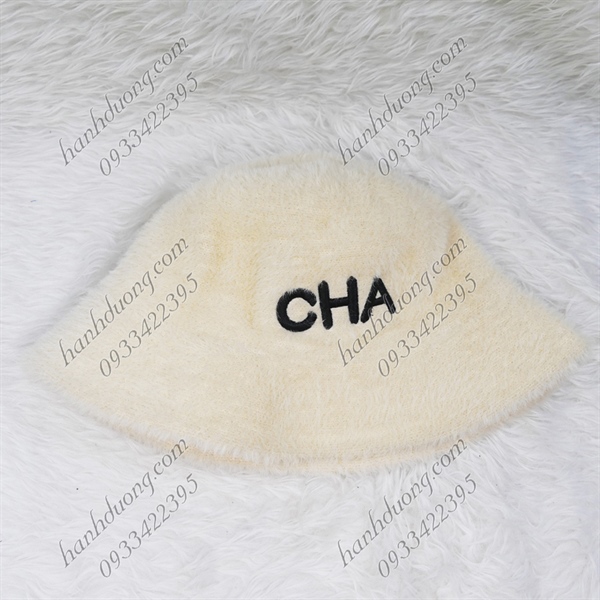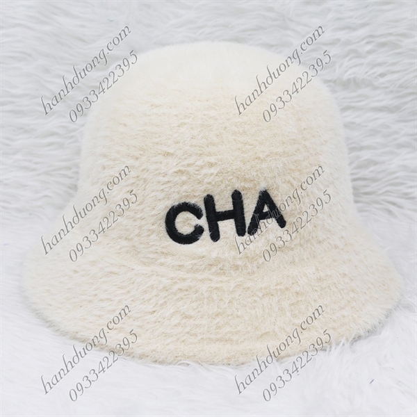 Nón bo cúp lông xù hàng quảng châu thêu chữ CHA, vành rộng 5cm, phía trong có 2 dây rút giúp giữ nón chắt hơn – Kem