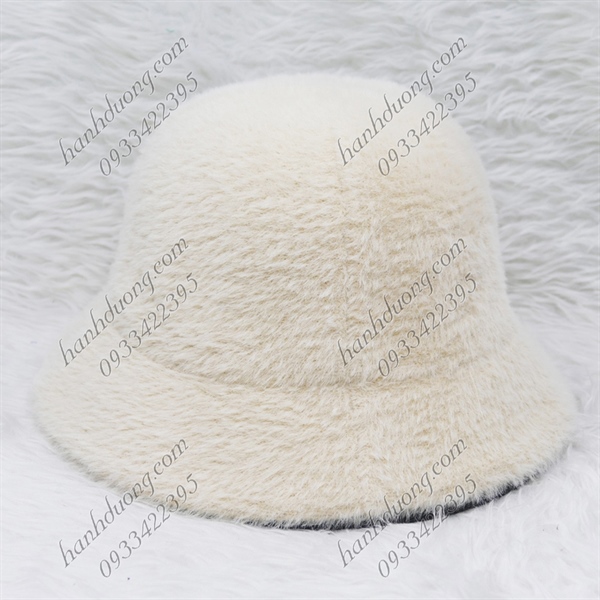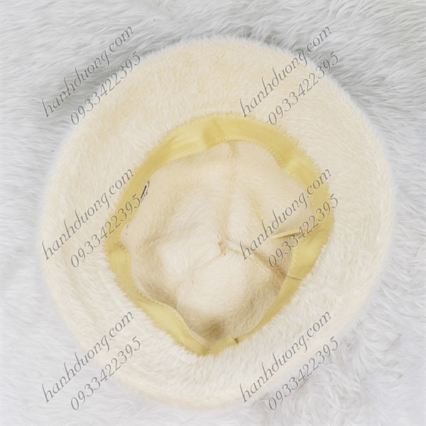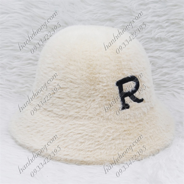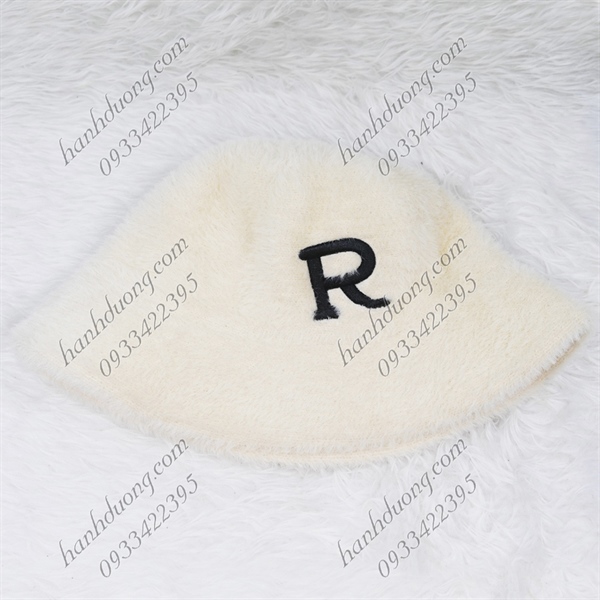 Nón bo cúp lông xù hàng quảng châu thêu chữ R, vành rộng 5cm, phía trong có 2 dây rút giúp giữ nón chắt hơn – Kem