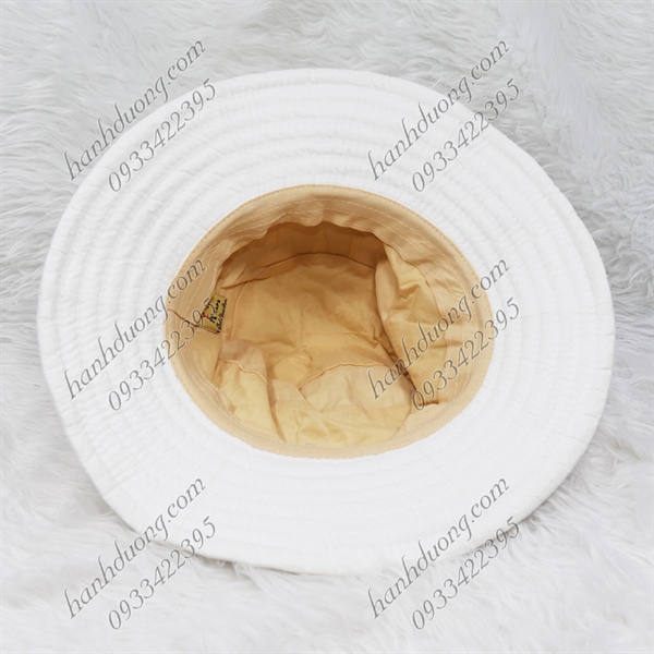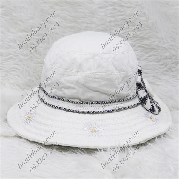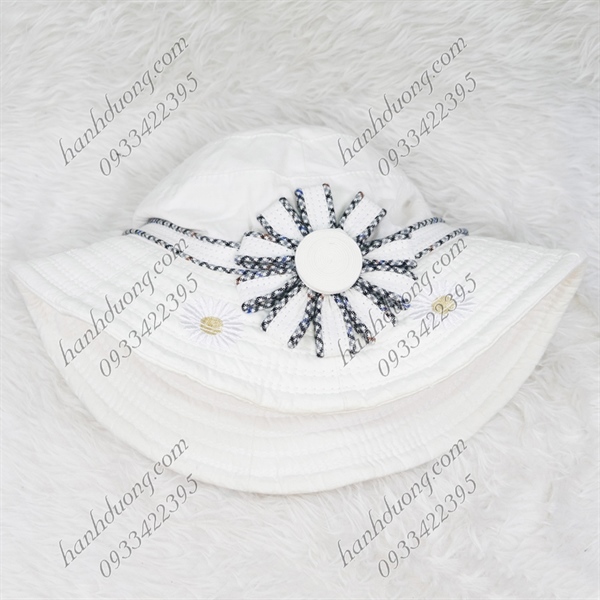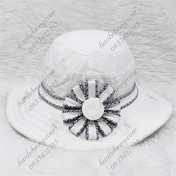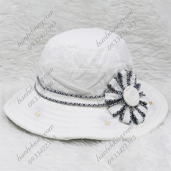 Nón bo vành rộng 7cm gắn hoa và thêu hoa xung quanh vành nón, vải cotton cao cấp của AT – Trắng