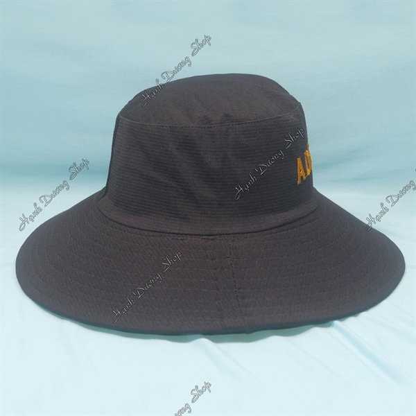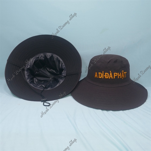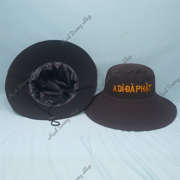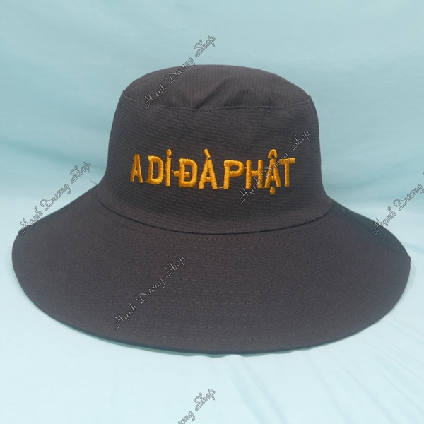 Nón Bucket Thêu Chữ A Di Đà Phật, Nón Tai Bèo Đi Chùa Vành Rộng 9cm Có Lớp Lót Phía Sau Nâu Đậm